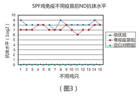 (一)在實驗室條件下,SPF雞7日齡一次免疫倍優?系列產品(ND + H9 ) 0.1ml ,免疫后21天,倍優組ND和H9抗 體分別達到8.1log2 (圖3 )和8.6log2 (圖4 );常規疫苗組ND和H9抗體分別僅為7.3log2 (圖3 )和7.6log2 (圖4)。