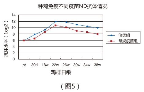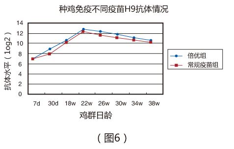 (二)在現場條件下,種雞分別與7日、30日和18周分別免疫倍優TM系列產品(ND+H9),劑量分別為0.1ml、 0.3m和0.3ml。于22周,倍優組ND和H9抗體分別達到12log2 (圖5 )和12.2log2 (圖6 ),且維持時間明顯優于常規疫苗組;常規疫苗組ND和H9抗體分別僅為10.7log2 (圖5 )和11.8log2(圖6 )。