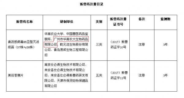 根據(jù)《獸藥管理條例》和《獸藥注冊辦法》規(guī)定,經(jīng)審查,批準(zhǔn)華南農(nóng)業(yè)大學(xué)等9家單位申報的禽流感病毒H5亞型滅活疫苗(D7株+rD8株)等2種產(chǎn)品為新獸藥,核發(fā)《新獸藥注冊證書》,并發(fā)布產(chǎn)品試行規(guī)程、質(zhì)量標(biāo)準(zhǔn)、說明書和標(biāo)簽,自發(fā)布之日起執(zhí)行。