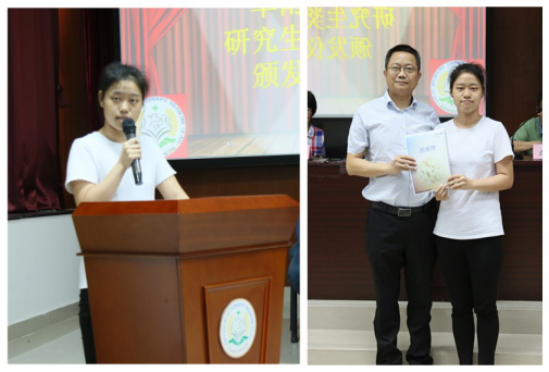 獲獎代表朱夢嬌同學發(fā)言,向華南生物表示敬意及感謝,承諾以后更加努力學習,時刻鞭策自己,以取得更加優(yōu)異的成績并投桃報李。