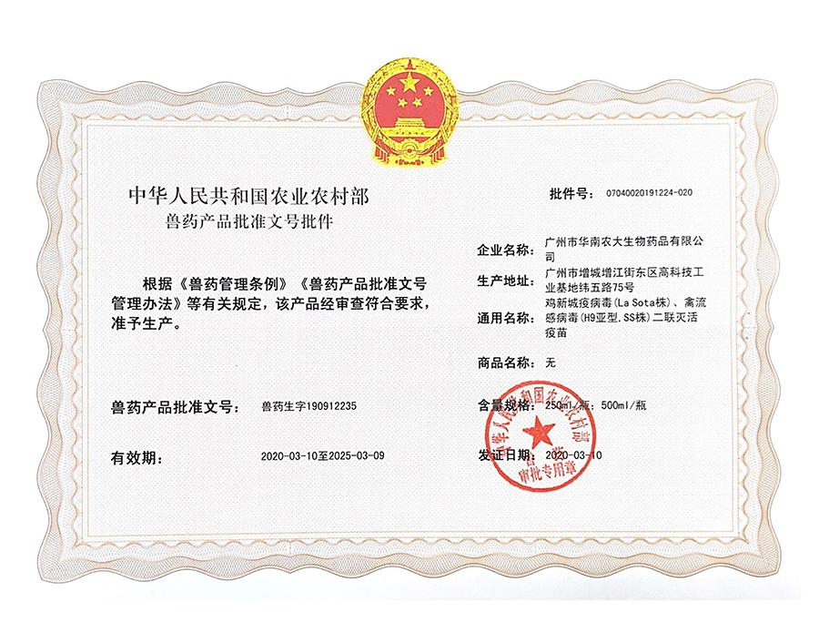 獸藥生產許可證:(2022)獸藥生產證字19091字