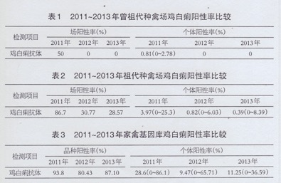 2011~2013年曾祖代、祖代種禽場和地方品系雞雞白痢陽性率進行比較(見表1、2、3)可見,曾祖代種禽場除了2011年檢測陽性率較高外,2012~2013年檢測結(jié)果都比較好,陽性率為0;祖代種雞場持續(xù)保持雞白痢抗體陽性,但整體陽性率處于降低的水平,局部雞場可能出現(xiàn)了反彈;家禽基因庫雞白痢抗體陽性率保持在很高的水平。雞白痢抗體陽性率整體處于下降水平,但是在這些種雞群中存在ALV、REV等不同病原的兩重或多重感染。
