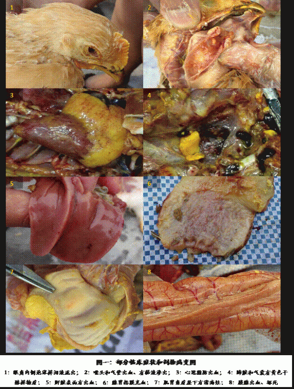剖檢可見喉頭、氣管粘膜充血、出血,氣管內充滿粘液,肺臟出血,氣囊渾濁、有黃色干酪樣物質,心冠脂肪有針尖樣出血,部分雞肝臟略顯腫大、有少量出血點,脾臟腫大、部分有白色斑點狀壞死,腎臟腫大、部分有尿酸鹽沉積,盲腸扁桃體腫大,腺胃粘膜充血,肌胃角質層下有斑點狀潰瘍,胰腺輕微出血、有白色壞死點,腸道黏膜出血。