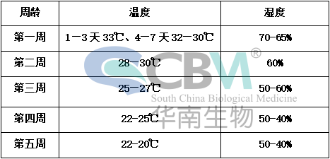 雞只周齡不同,需要的溫度也不同,各周齡適宜的溫度(在相對(duì)濕度達(dá)標(biāo)的前提下)。