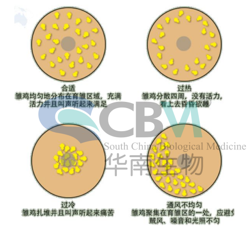 在實(shí)際飼養(yǎng)過(guò)程中。要根據(jù)情況看雞施溫。判定溫度是否適宜還要取決于雞群狀態(tài)。在正確的溫度下雞群散開,雛雞一般20—30只為一個(gè)群體,且不同群體間的雛雞相互運(yùn)動(dòng),叫聲清脆。溫度過(guò)高,雛雞沒有叫聲,張口喘氣,頭和翅膀下垂,遠(yuǎn)離熱源。溫度過(guò)低,雛雞在靠近熱源處扎堆,發(fā)生悲鳴的叫聲。賊風(fēng)、光照不均、外界噪音也會(huì)引起扎堆情況,要認(rèn)真觀察,加以區(qū)分。
