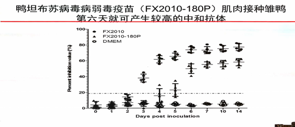 疫苗無法通過黏膜免疫產生有效的免疫應答,只能通過肌肉注射的方式,免疫后4-6天能夠產生中和抗體,但應該考慮過早免疫,雛鴨母源抗體的影響,同時也應該考慮免疫后抗體持續期能否保護至出欄,所以應該進行科學的抗體監測來制定合理的免疫方案。