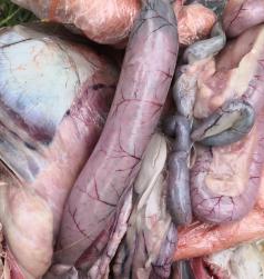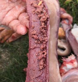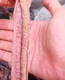 現(xiàn)場剖檢4只鵝,4/4只鵝出現(xiàn)腸粘膜脫漏、腸道充滿血樣液體、空腸回腸出現(xiàn)蠟樣栓塞;4/4只鵝出現(xiàn)胰腺有壞死點;4/4只鵝腎腫脹;呼吸道癥狀不明顯,如下圖: